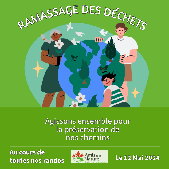 Nous vous rappelons que lors des 3 randonnées prévues le 12 Mai 2024 chaque groupe effectuera la traditionnelle sortie de collecte de déchets le long de son parcours.